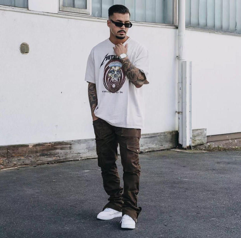 Pantaloni da uomo in cotone 100% personalizzato con 6 tasche laterali larghi pantaloni Cargo Modulare orlo svasati pantaloni della tuta impilati per uomo