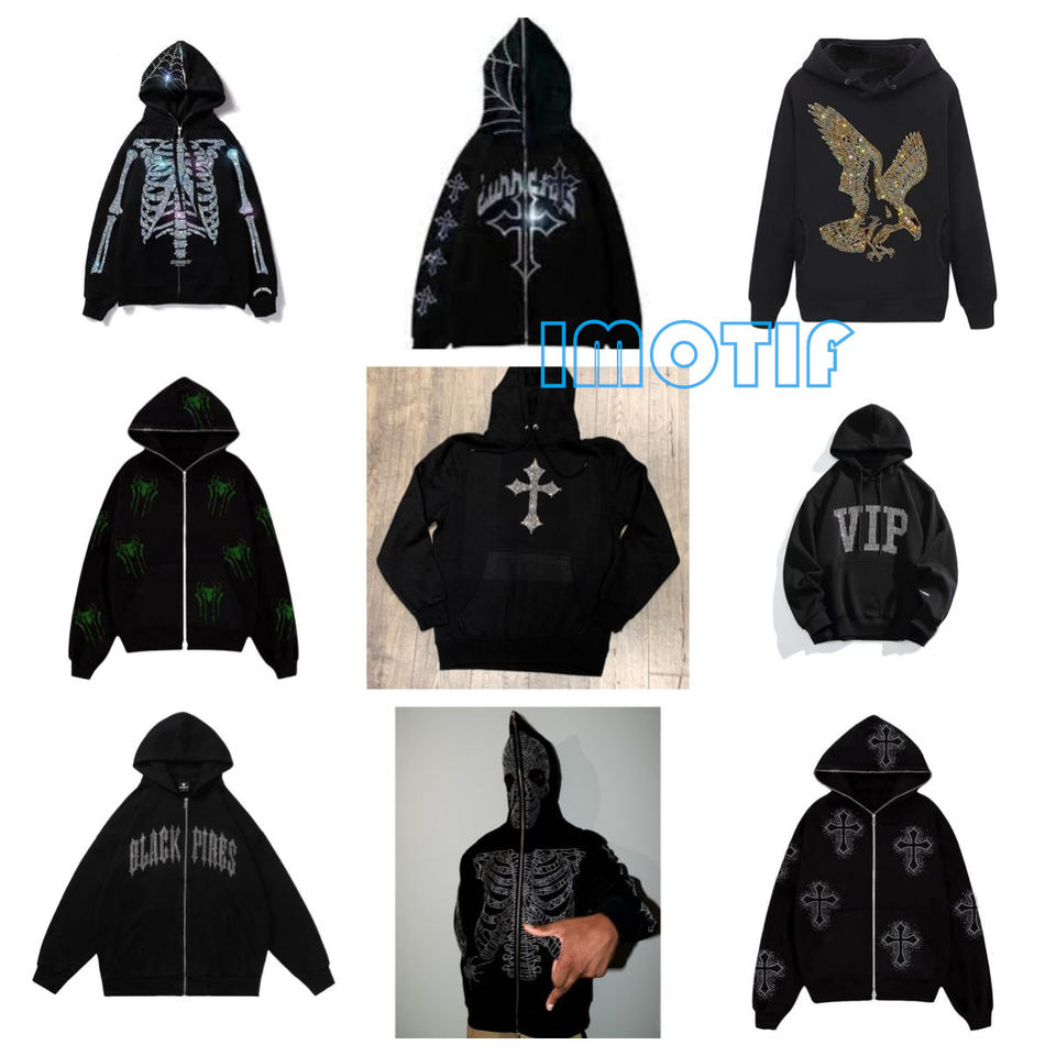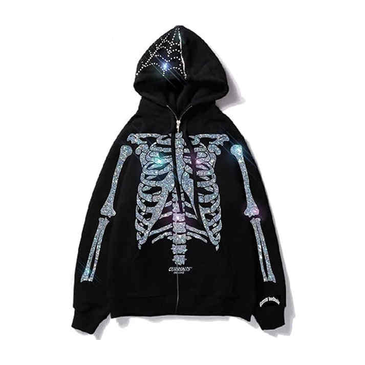Custom 100% Cotton Zip-Up Hoodie and Sweatpants Set Winter Embroidered and Beaded Rhinestone Skeleton Design