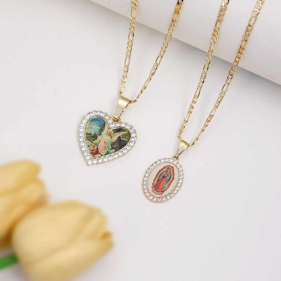 Custom 14K Gold Plated Guadalupe Cross Pendant Necklace Variety Religious Jewelry with Heart and Link Chain Zircon Inlay