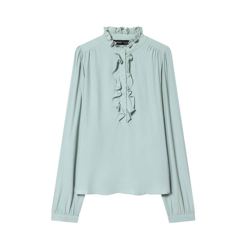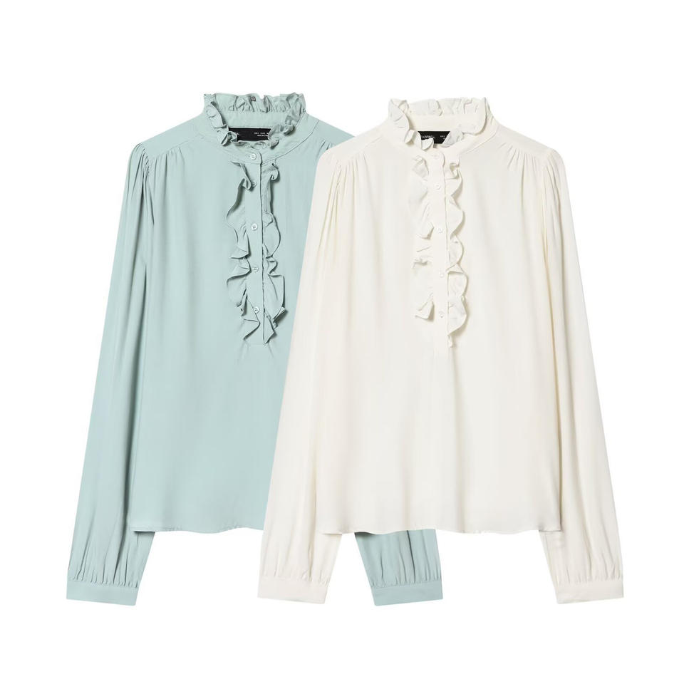 Camicetta Personalizzata Primavera 2026 Tinta Unita - Camicia a Maniche Lunghe con Colletto a Balze e Dettaglio Volant, OEM/ODM da Fabbrica di Abbigliamento Cinese