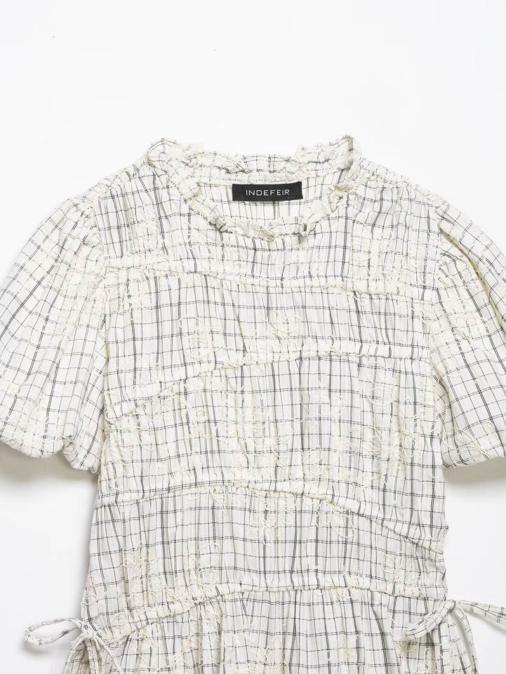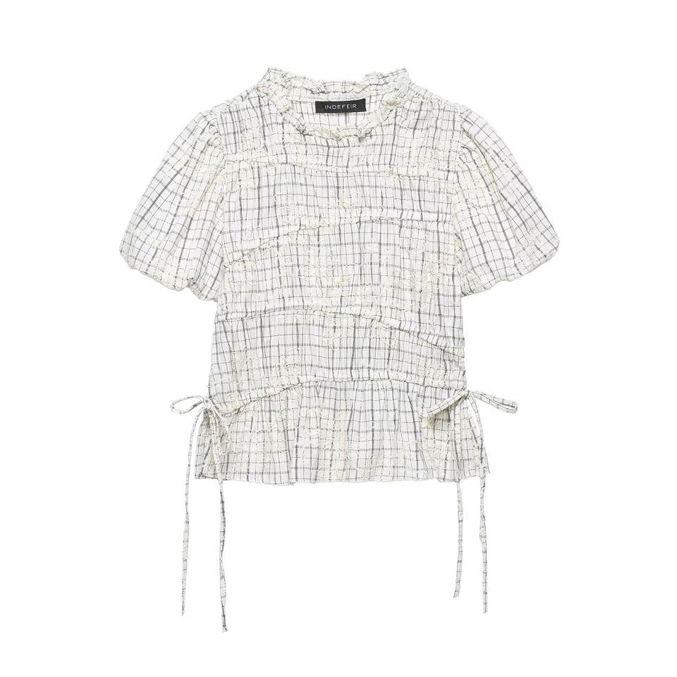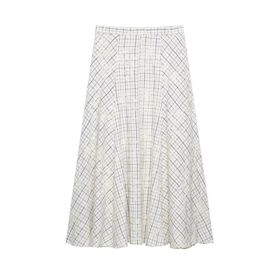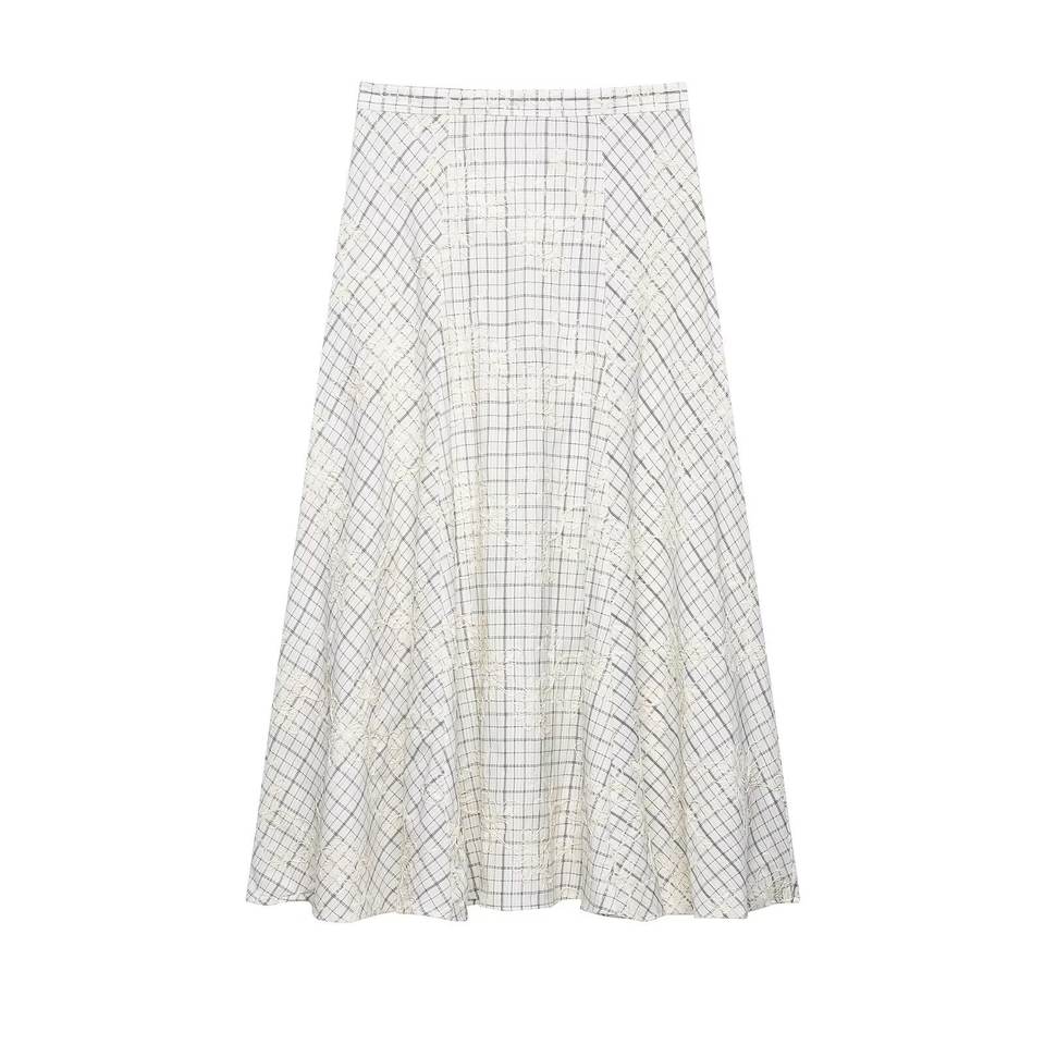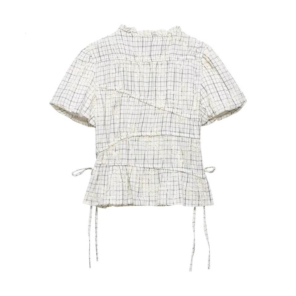 Completo coordinato due pezzi da donna primavera 2026: camicetta a quadri con volant e gonna ricamata con fiocco, personalizzabile OEM/ODM da fabbrica di abbigliamento cinese