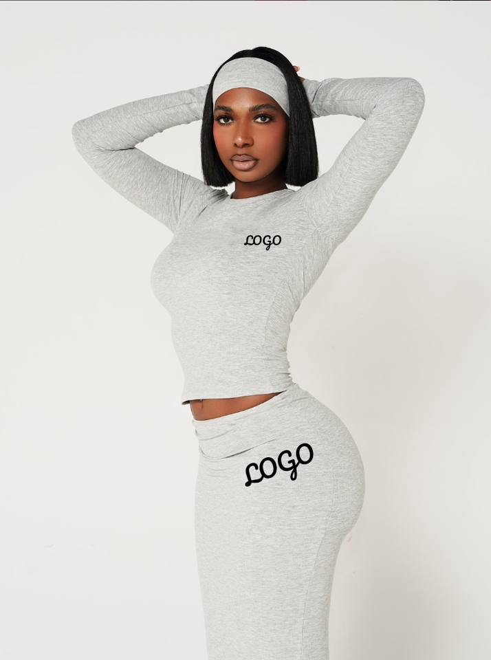 Set personalizzato 3 pezzi abbinato t-shirt a maniche lunghe e abito lungo aderente Maxi con fascia da donna abbigliamento da donna