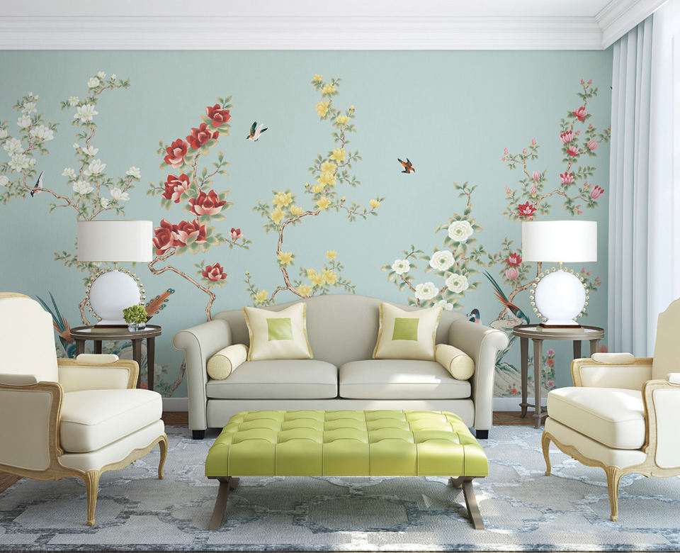 Carta da Parati Murale 3D Personalizzata con Motivi Chinoiserie di Fiori e Uccelli, Design Dipinto a Mano in Stile Cinese, Adesivo Murale
