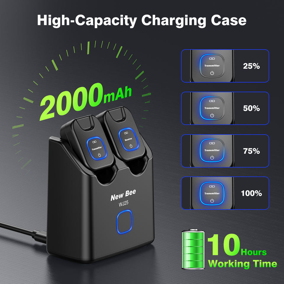 Capacità della batteria:Custodia di ricarica: 2000mAh, Ricevitore: 300mAh, Trasmettitore: 500mAh