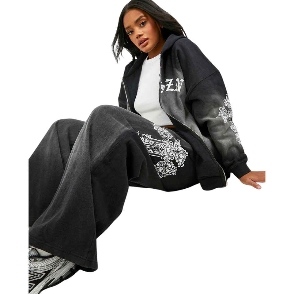 Completo Sportivo Due Pezzi Personalizzato Effetto Acido Sbiadito Vintage con Felpa con Zip e Pantaloni a Gamba Dritta Svasati per Fitness Adulti