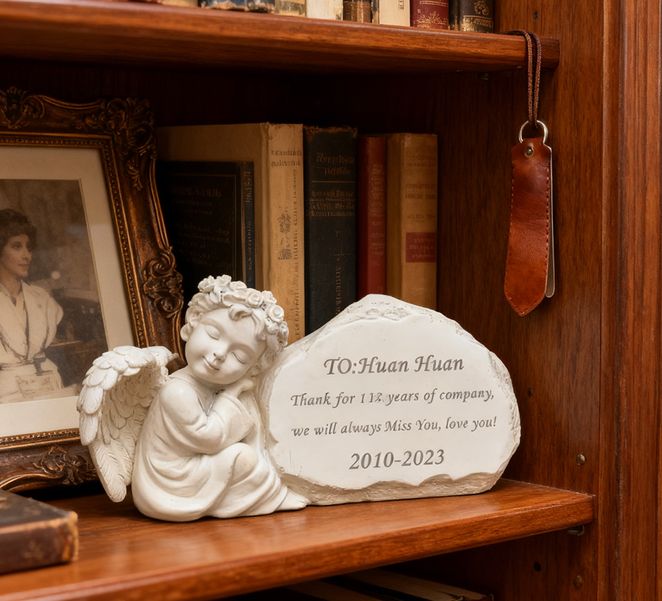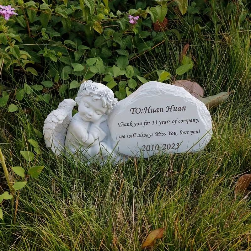 Scultura Commemorativa Personalizzata Gatto Angelo, Gattino Dormiente in Resina Bianca con Ali su Targa a Cuore, Ricordo Artigianale per la Perdita di Animali Domestici