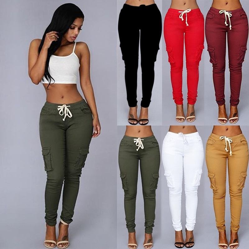 Su misura delle Donne di Autunno Multi-bag Coulisse Cravatta Solido Casuale Pantaloni A Vita Bassa di Moda Collant Pantaloni Lunghi Skinny Pant per le Signore