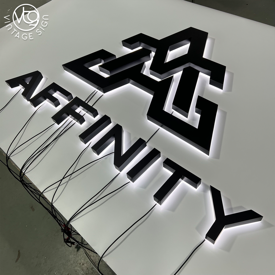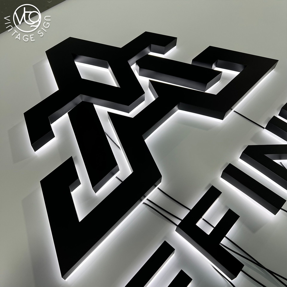Insegne Luminose LED Personalizzate con Retroilluminazione Nera, Logo 3D in Metallo per Uffici, Aziende e Negozi