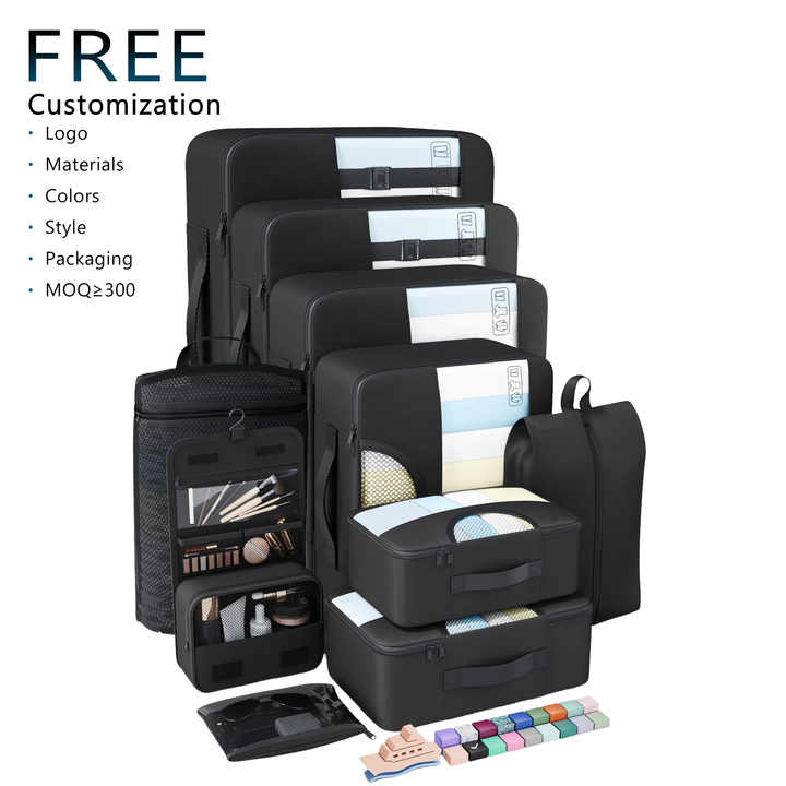 Set di borse da viaggio personalizzate alla moda nere con chiusura a cerniera per imballaggio portatile cubetti Organizer 10 taglie per accessori di viaggio
