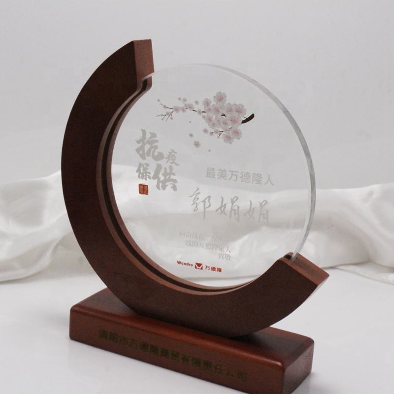 Custom Block Souvenir Music Piano Sample Manufacturer 3D Glass and Wood Shield Wooden Award Gold Plaque Trophy with Wood Base