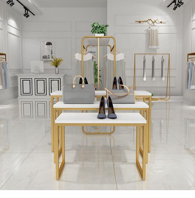 Custom Boutique Gold Clothing Wall Mounted Rack Nesting Table Clothes Shelving Garment Display Rack Clothing Store Furniture