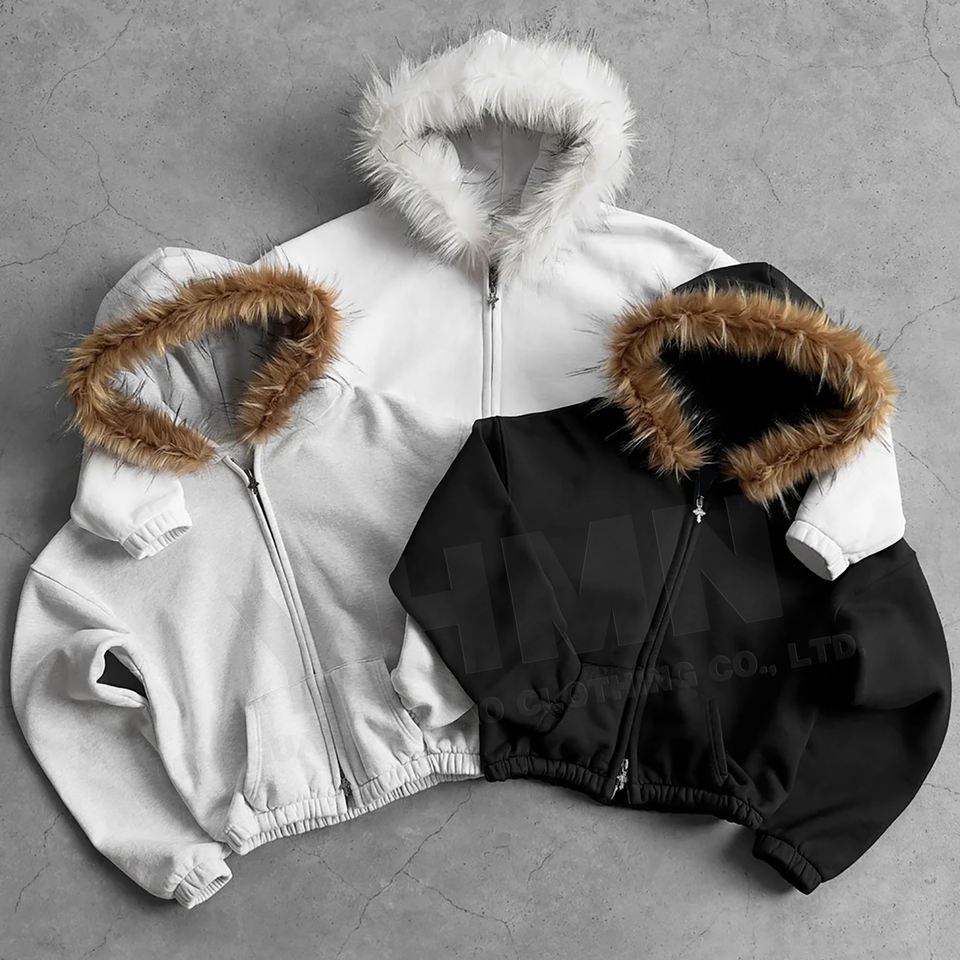 Felpa da Uomo Vintage con Zip e Cappuccio Staccabile in Pelliccia Sintetica, Taglio Boxy, in Cotone Biologico French Terry, Tinta Unita, con Doppia Cerniera, Personalizzabile