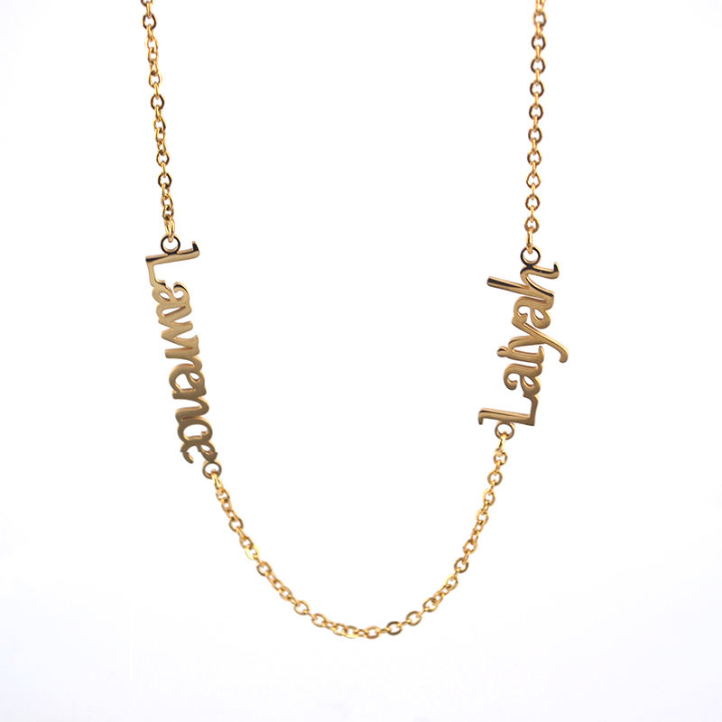 Collana con ciondolo a due nomi a doppia catena riempita in oro 14 carati personalizzata in acciaio inossidabile corsivo personalizzato