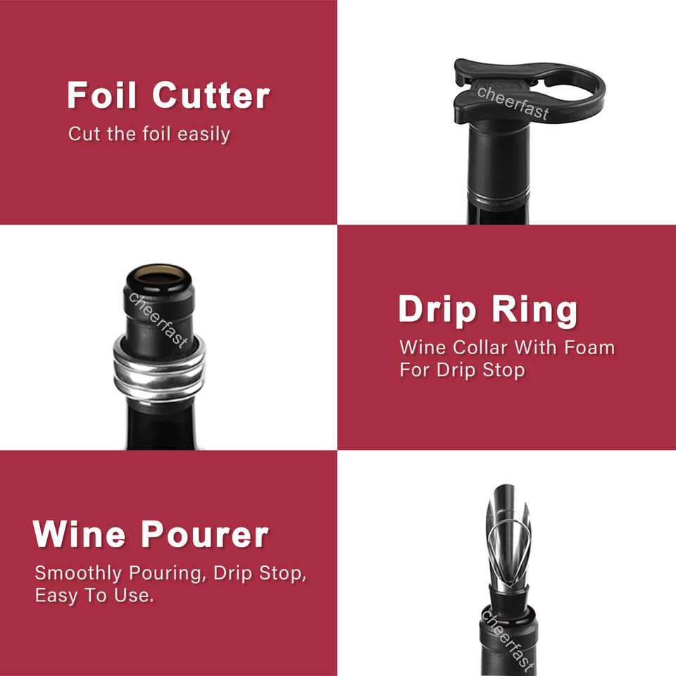 Funzione:Apri il vino, versa, mantieni il vino fresco, sistema antigoccia, posiziona gli scacchi