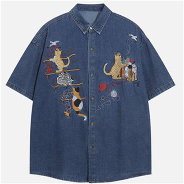 Camicia Estiva Casual da Uomo a Maniche Corte con Ricamo Personalizzato, Motivo Geometrico a Righe