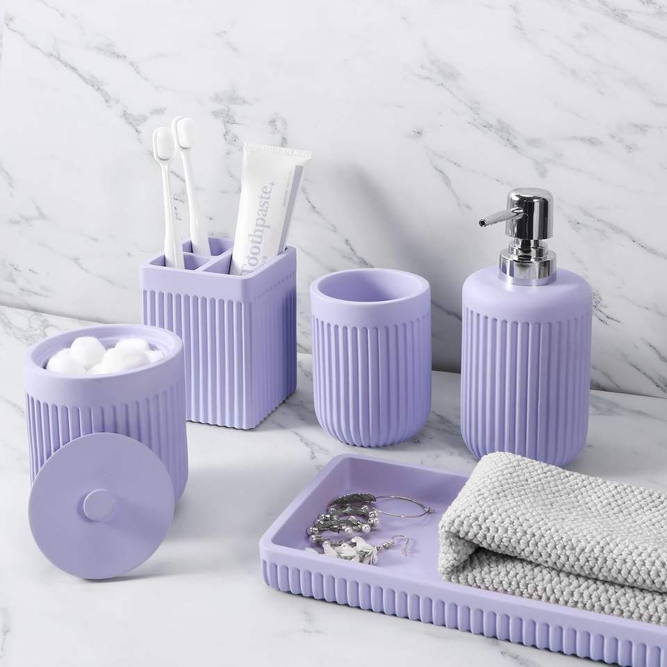 Set di accessori per il bagno in resina viola elegante a colori personalizzati con Dispenser di sapone a strisce verticali