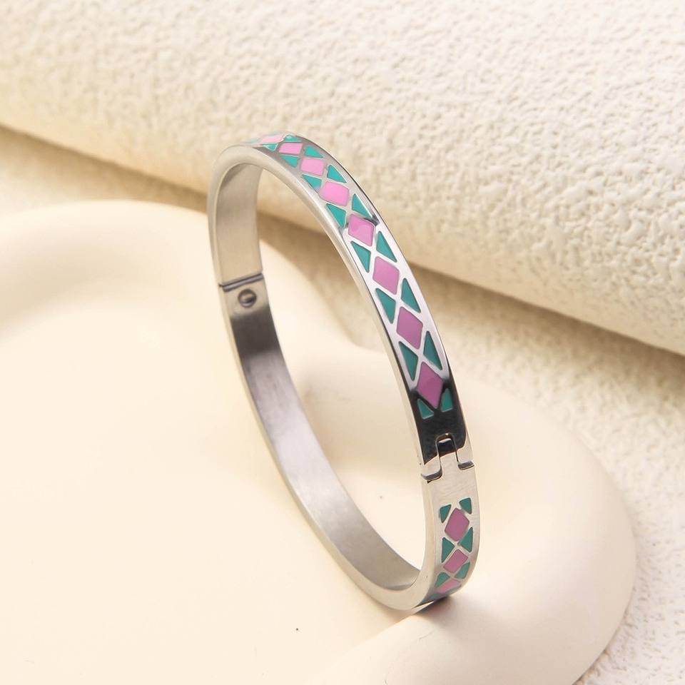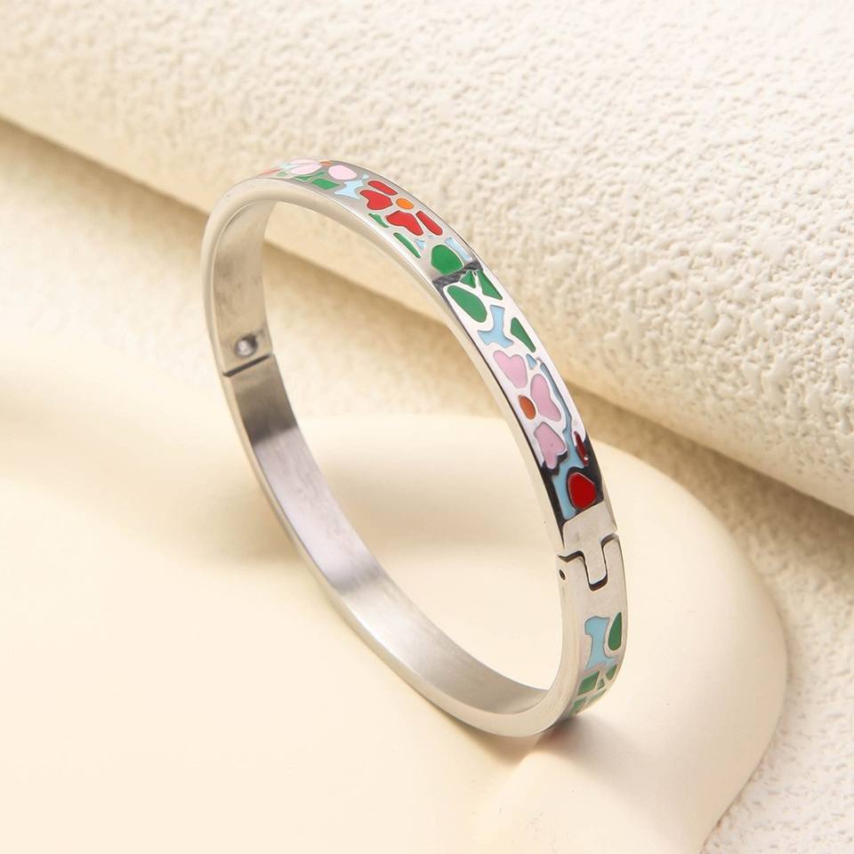 Bracciale a Polsino Aperto con Stampa Artistica Boho in Smalto Colorato Personalizzato, Impermeabile in Acciaio Inossidabile, Gioielli Impilabili a Molla per Donna