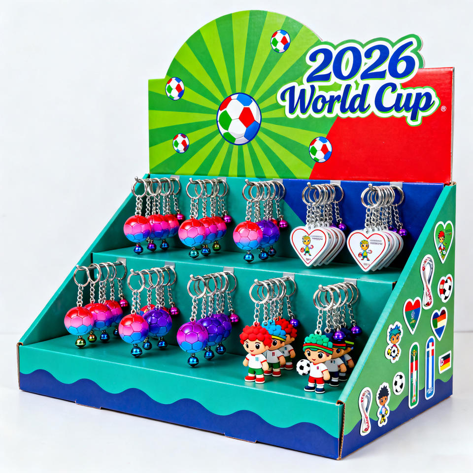 Ripiano personalizzato 2026 stile coppa del mondo di calcio scatola di esposizione in PVC portatile pieghevole appesa portachiavi giocattoli adesivo Stand