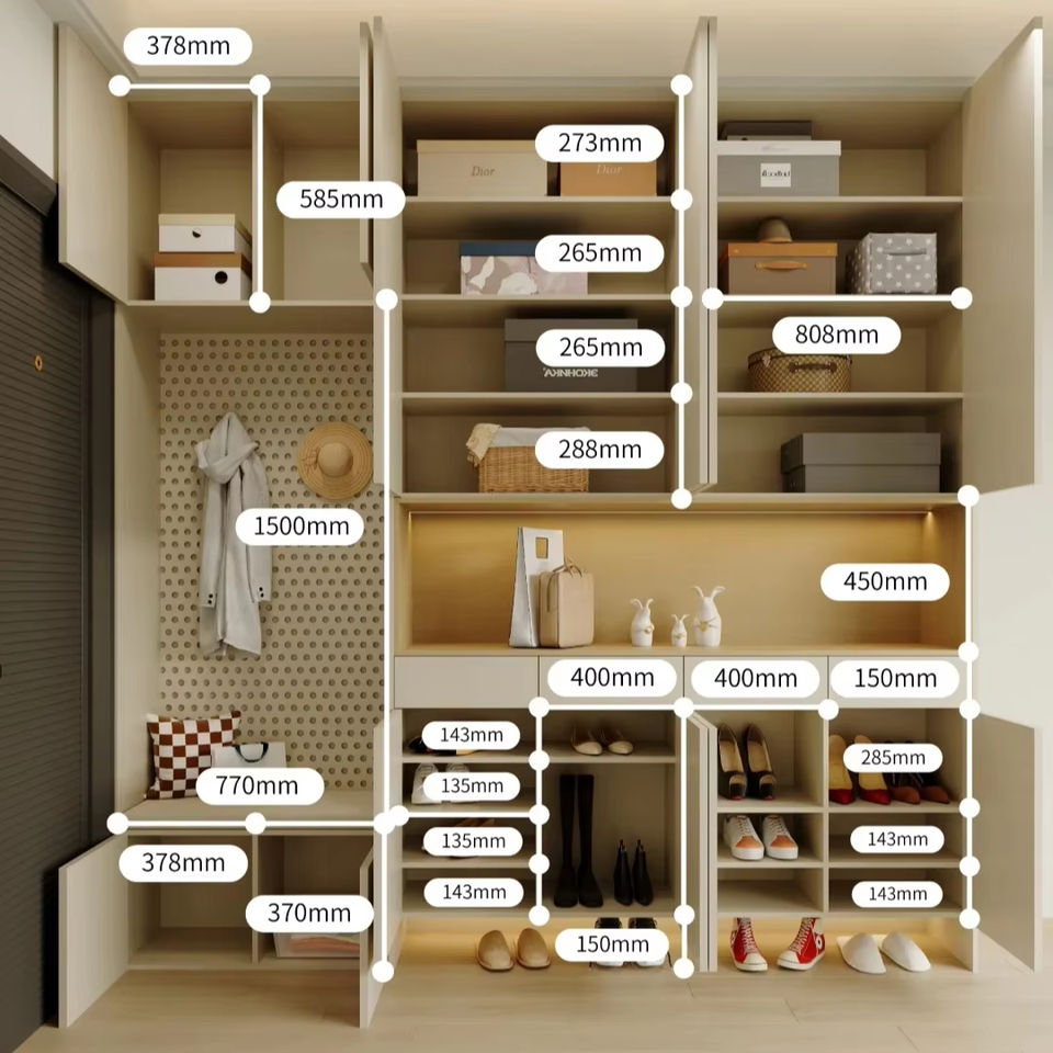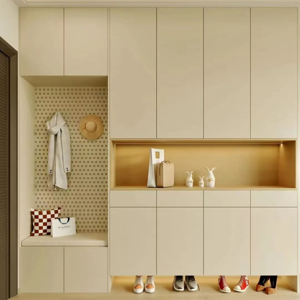 Custom Cream Style Entryway System - Coat Rack High-Capacity Design Shoe Cabinet
