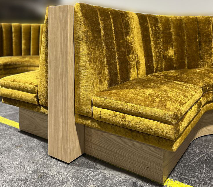 Custom Curved Velvet Banquette Seating with Channel Tufted Back, Commercial Booth Sofa for Restaurant, Café, Lounge, Hotel