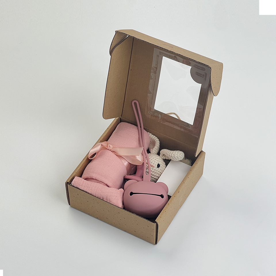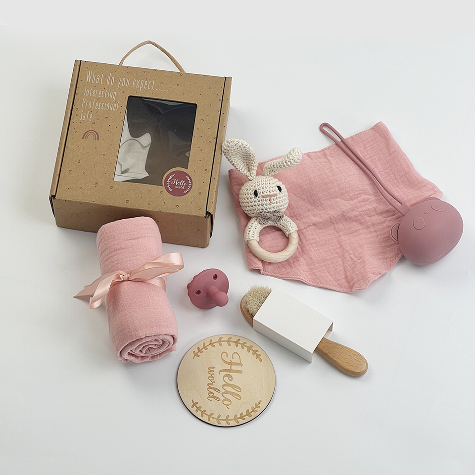 MULUN Set regalo 7 pezzi per neonato in mussola 100% cotone (fasciatura, bavaglino, giocattolo da dentizione) GOTS