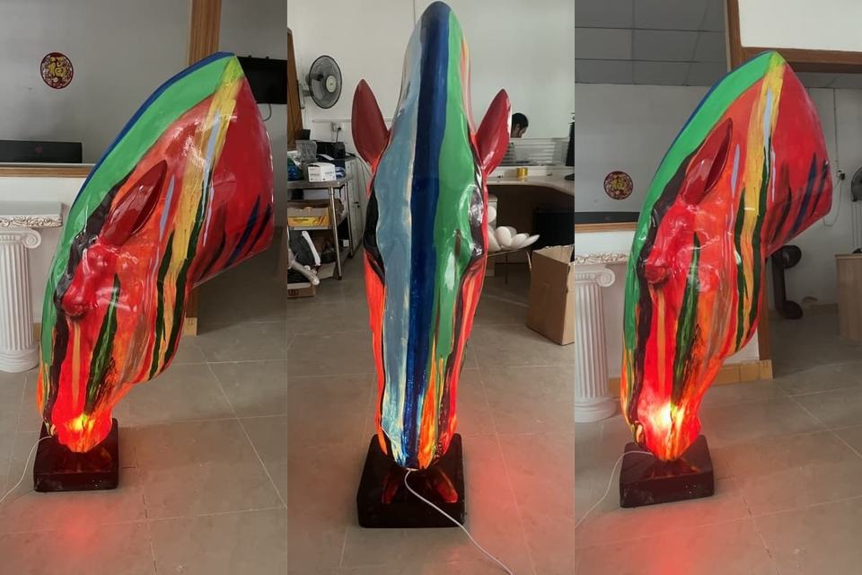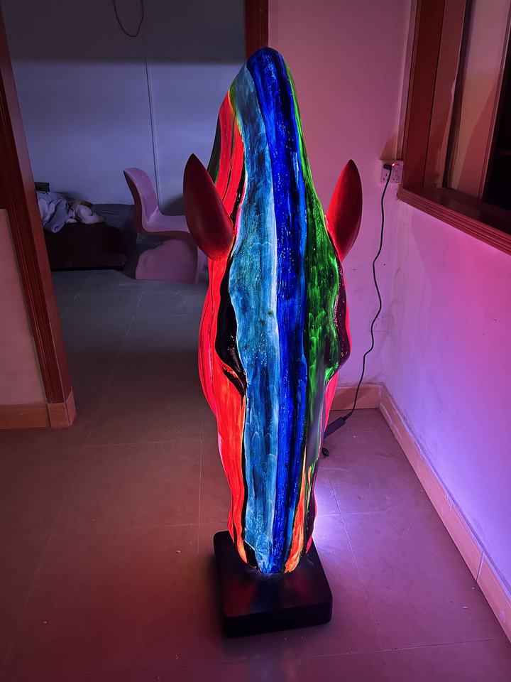 Scultura a testa di cavallo, progettata su misura, moderna per lo stile Pop Art, con lampada a LED da pavimento,