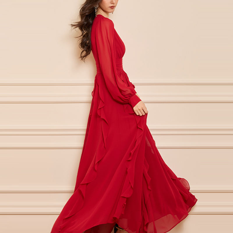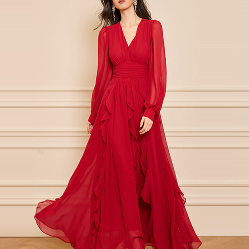 Custom Designer Women's Elegant Casual Scalloped Edge Long Sleeve High Quality Slit Chiffon Maxi Dresses