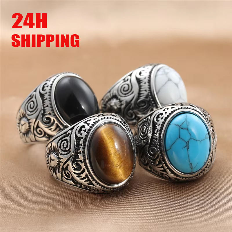 Anelli da Uomo Retrò con Design Personalizzato, Anelli Punk con Gemme Blu, Bianche, Argento, Verdi, Anelli Artigianali con Turchese e Occhio di Tigre