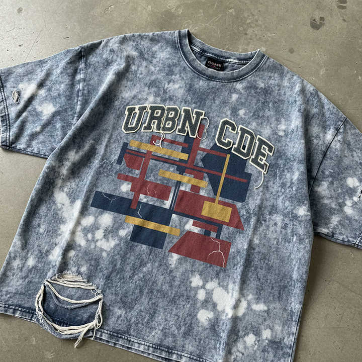 Custom Disha Men's Heavy Wash Color Short Sleeve Cotton Blend T-Shirt American Illustration Summer New High Street Couple