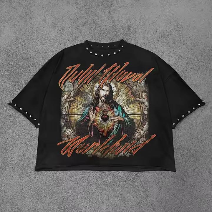 T-shirt da uomo cropped in cotone 100% personalizzata effetto distressed con strass, stile streetwear, grafica con strass, vestibilità ampia, colore bianco