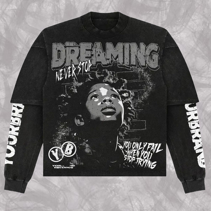 T-shirt Oversize con Stampa Grafica Personalizzata Effetto Consumato, Ricamo, Vestibilità Regolare, Lavaggio Acido, Maniche a Doppio Strato Patchwork