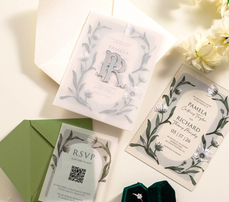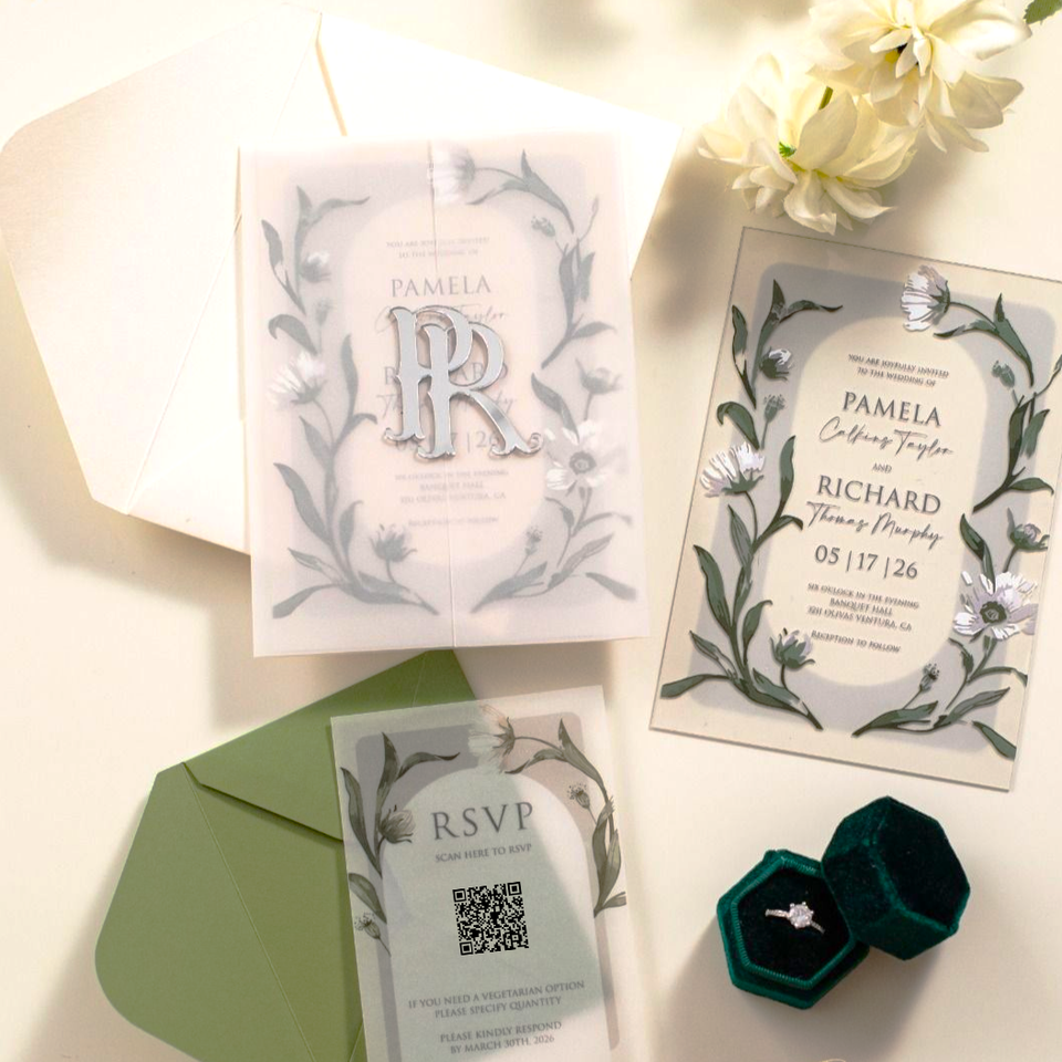 Carta di invito di nozze in acrilico trasparente con foglia verde elegante personalizzata ed elegante con nome d'argento Set di invito moderno