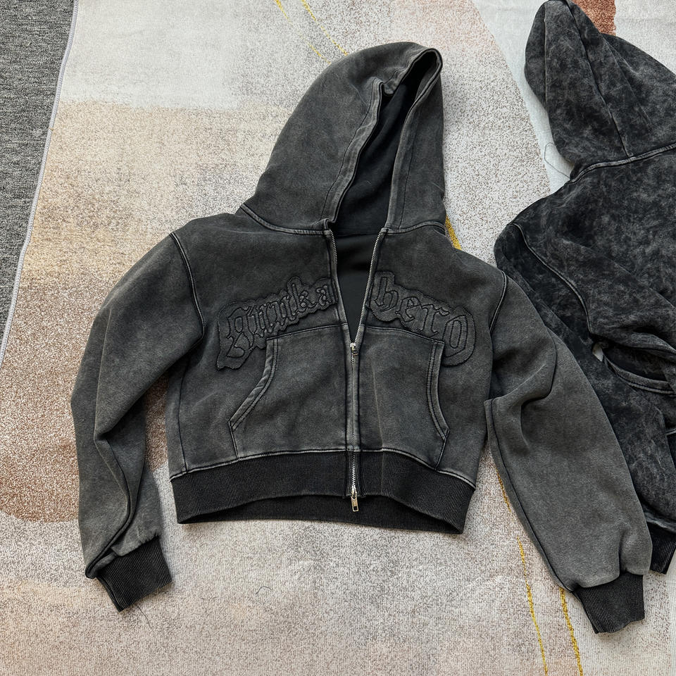 Felpa Corta con Cappuccio Personalizzata Ricamata Effetto Acid Wash Stile Streetwear Y2K con Zip per Donna