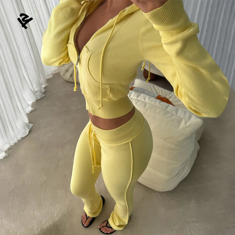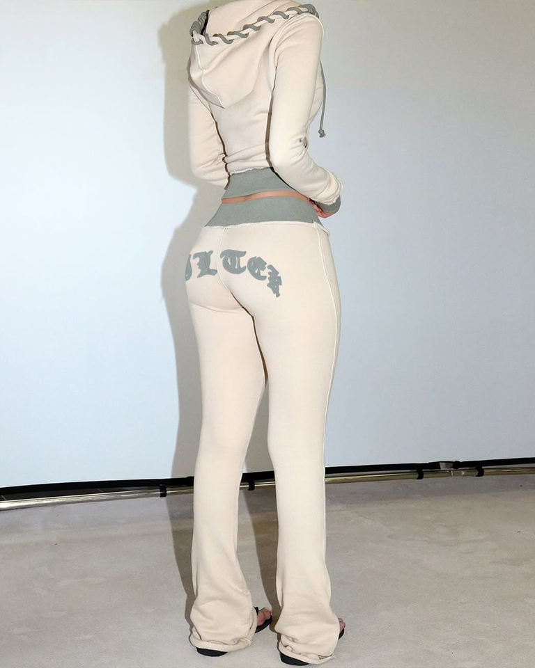 Custom Embroidery Patch Zip up Tracksuit Distressed Loungewear Women Sets Flared Sweatpants and Shell Stitch Hoodie Set