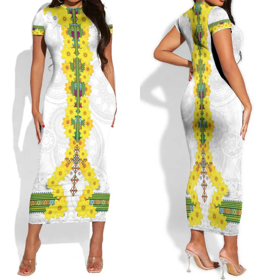 Custom Enkutatash Ethiopia New Year Short Sleeve Bodycon Dress Tilet Pattern With Flowers