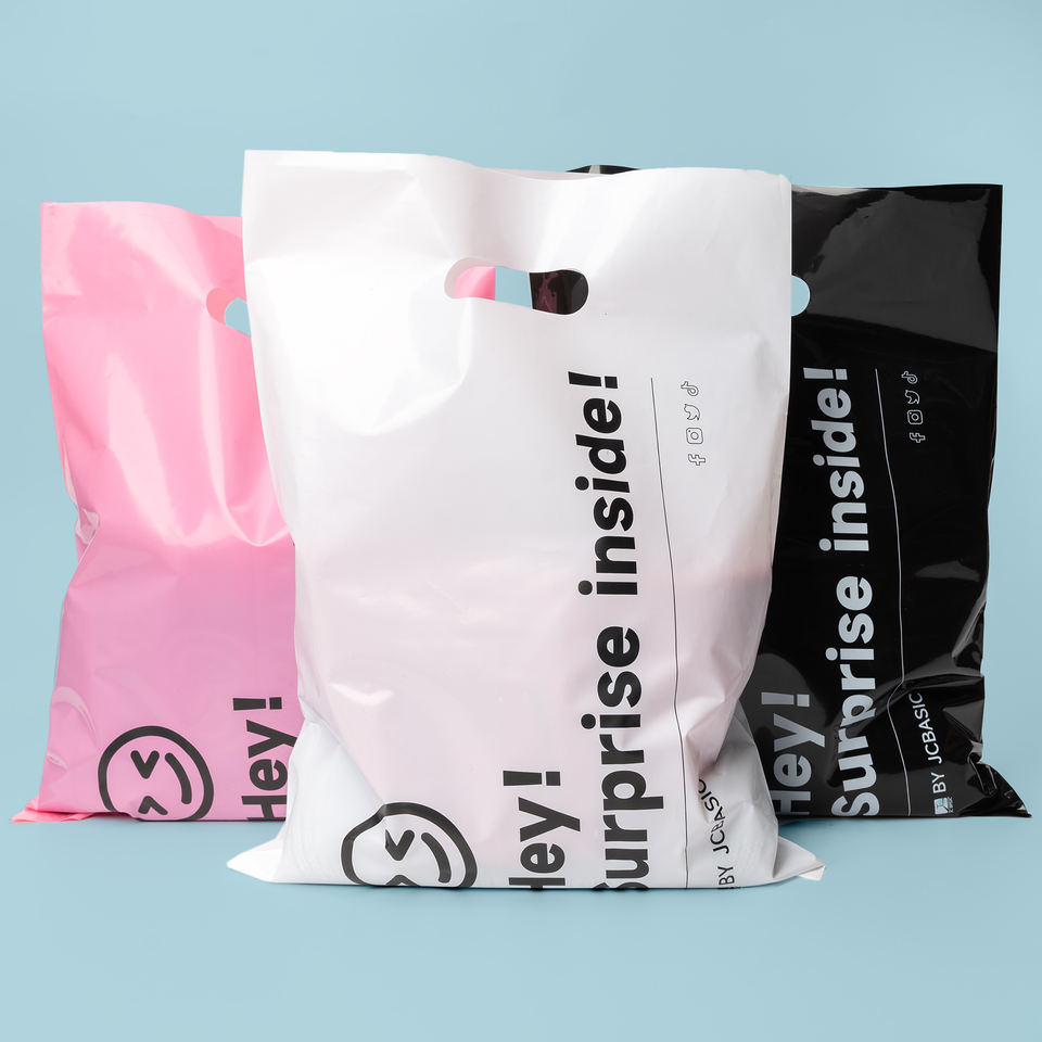 Buste Personalizzate in Plastica Riutilizzabili per Regali e Spedizioni, Sacchetti con Manici Fustellati per lo Shopping