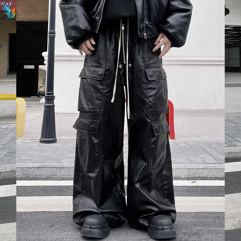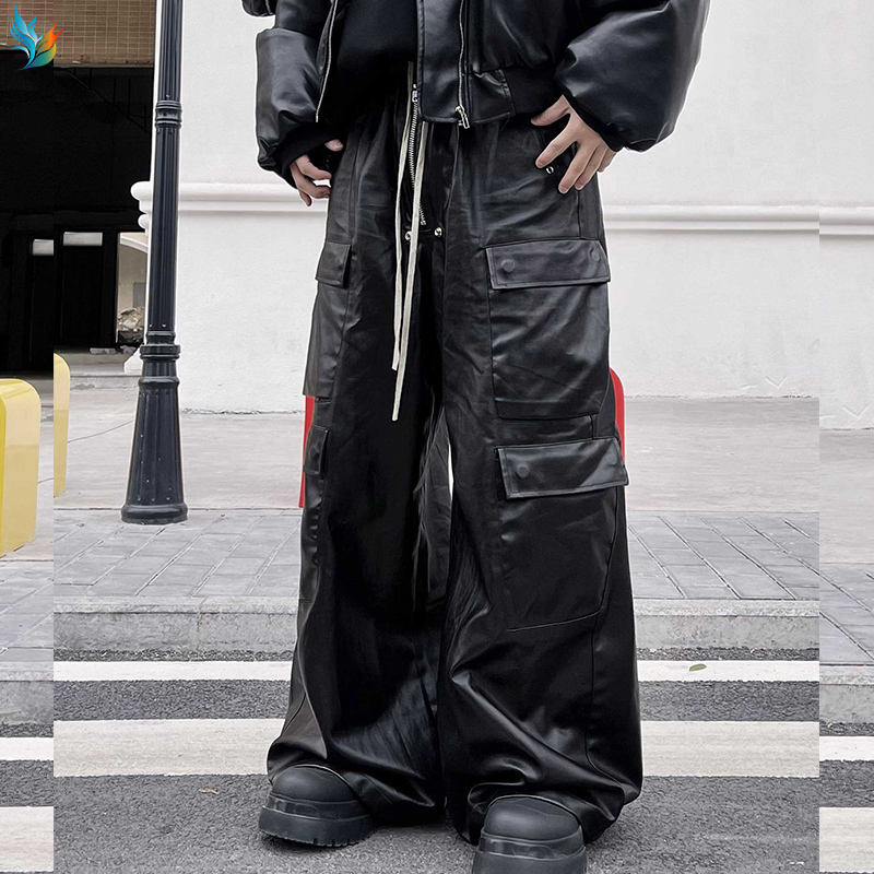 Custom Fashion Black Baggy Loose Coated Plain Hip Hop Baggy Pocket Cargo Flared Faux PU Leather Pants for Men