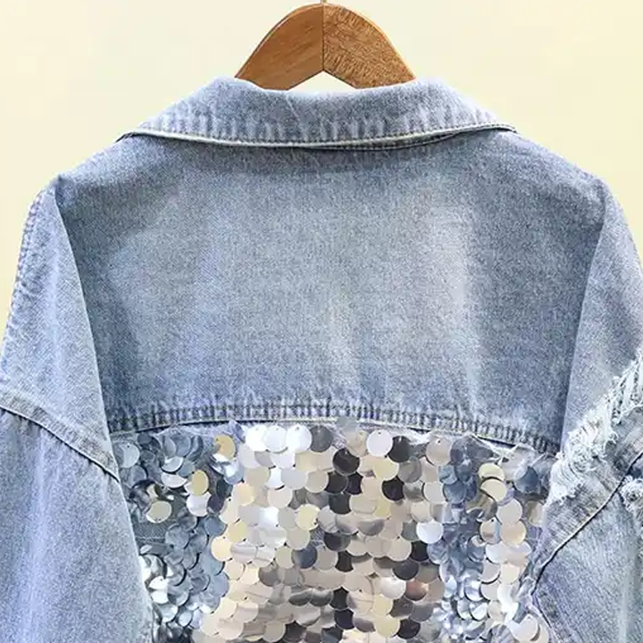 Giacca di Jeans da Donna Personalizzata Fashion con Design Unico e Toppe di Paillettes, Abbigliamento in Denim Lavato con Paillettes, Prodotta in Cina