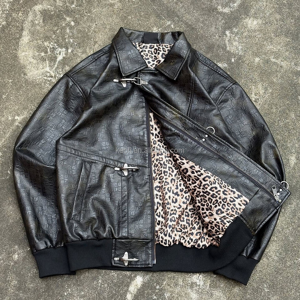 Giacca in Pelle Antivento Personalizzata con Fibbia da Pompiere, Cappotto Casual di Alta Qualità con Cerniera, Giacche da Uomo alla Moda con Fodera Leopardata