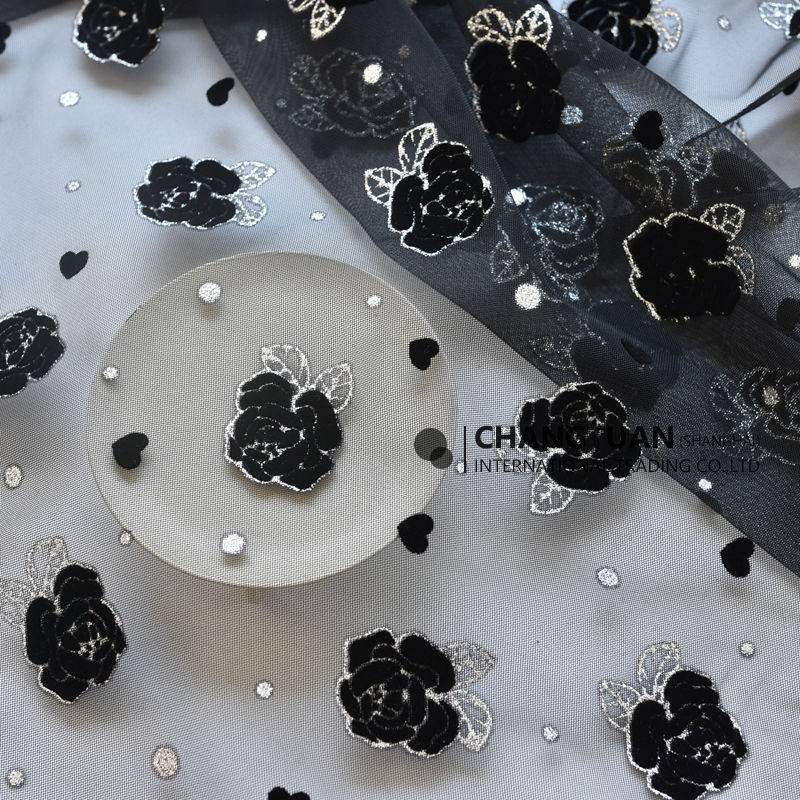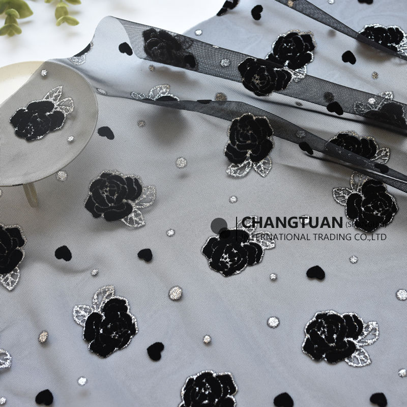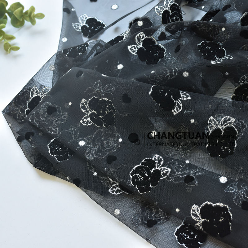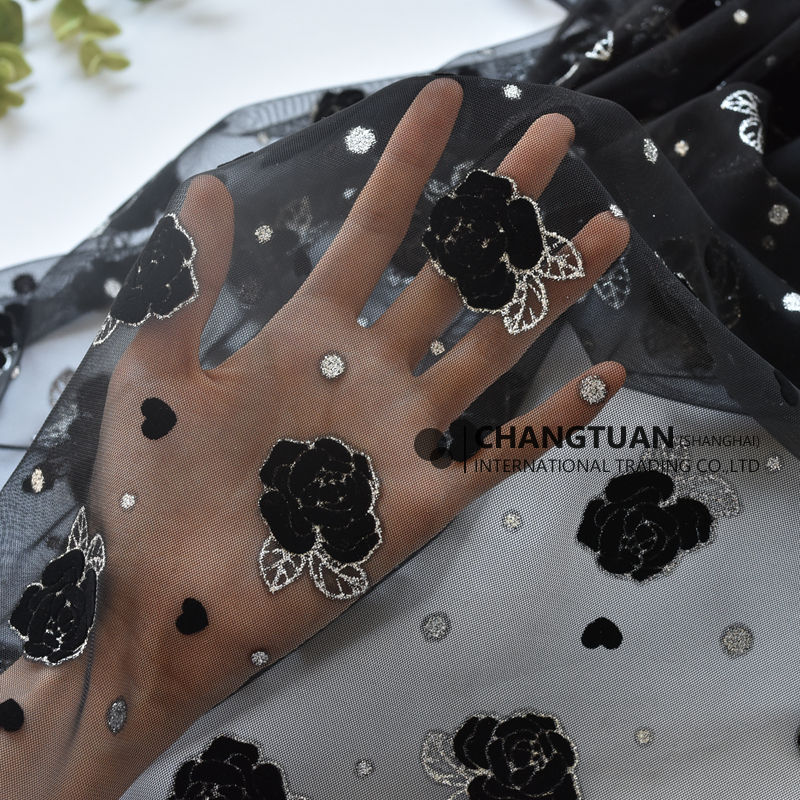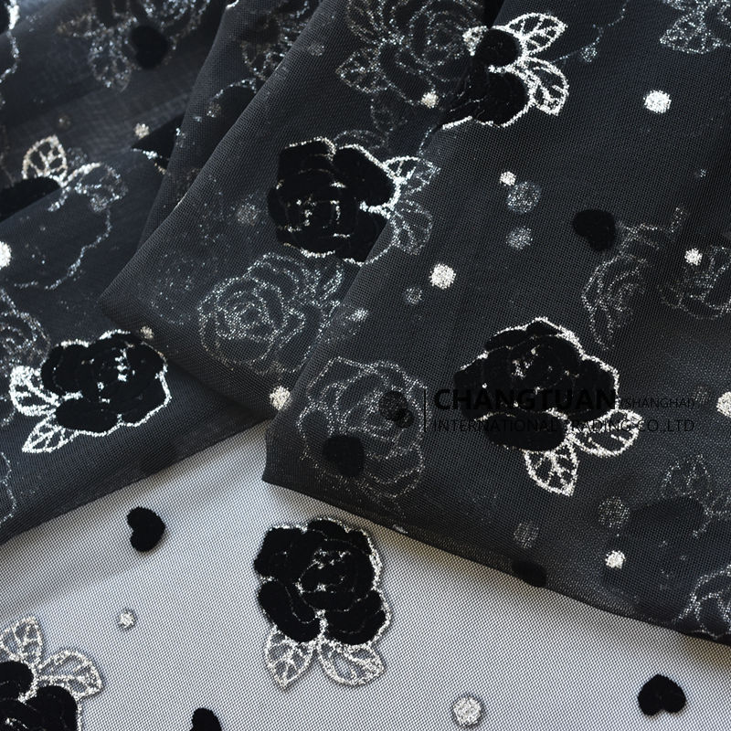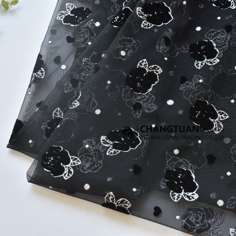 Tessuto personalizzato floccato in Tulle Mesh stampa lamina di tessuto in Tulle floccato con rosa per abiti
