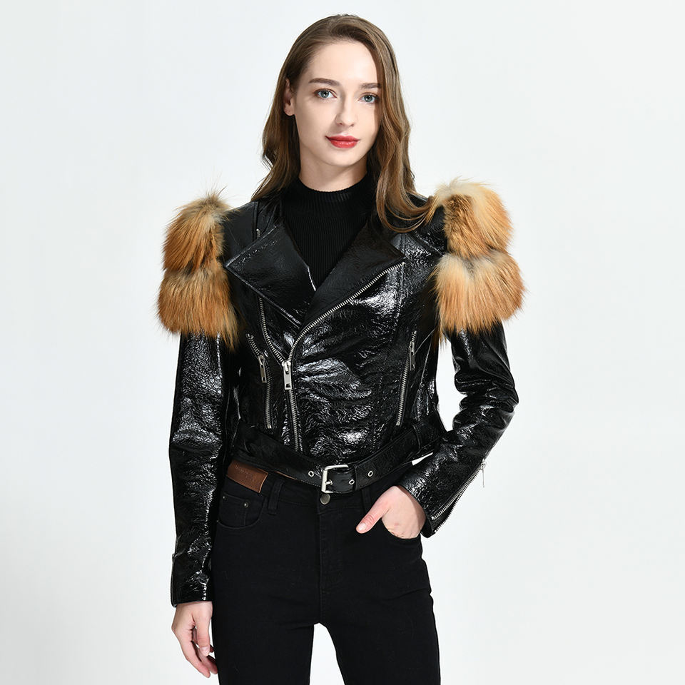 Custom Genuine Sheep Leather Jacket With Real Fox Fur Wholesale Ladies Cropped Real Sheepskin Motorcycle Leather Jacket Women