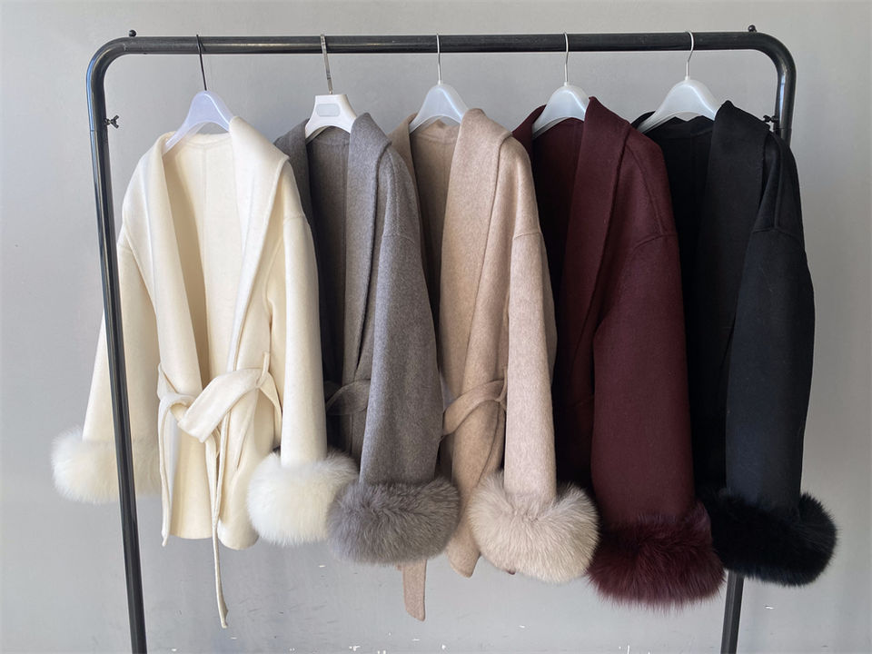 Cappotto da Donna Invernale su Misura Fatto a Mano da Esterno in Lana Bianca e Cashmere Double-Face con Cintura, Polsini di Lusso in Vera Pelliccia di Volpe