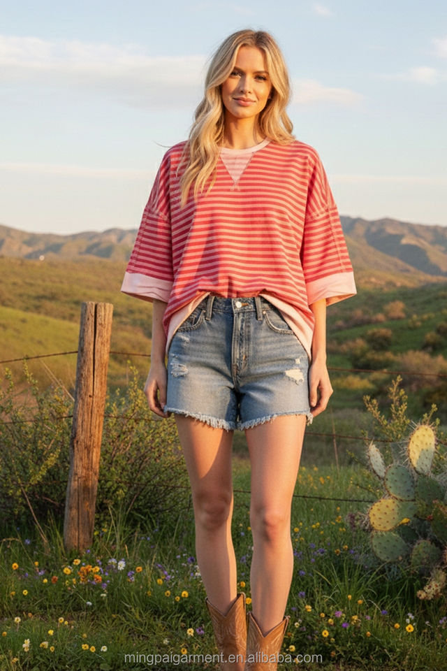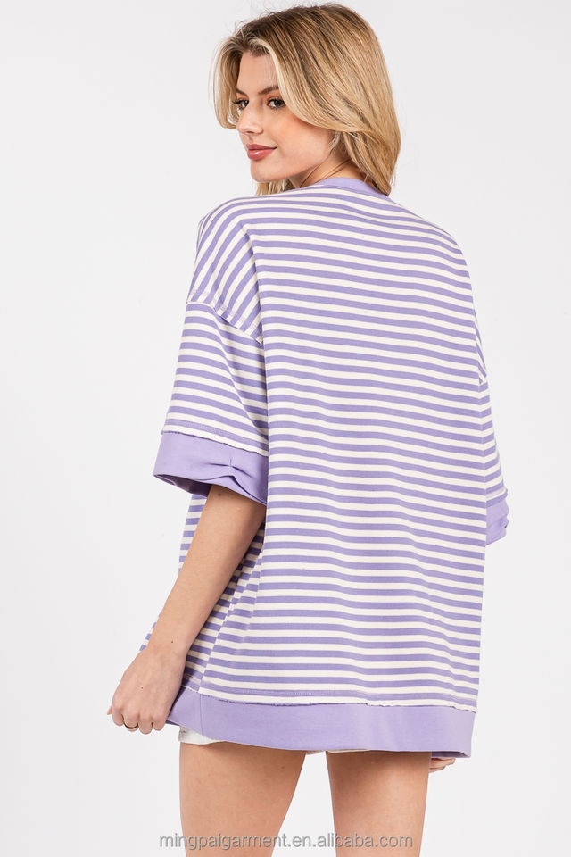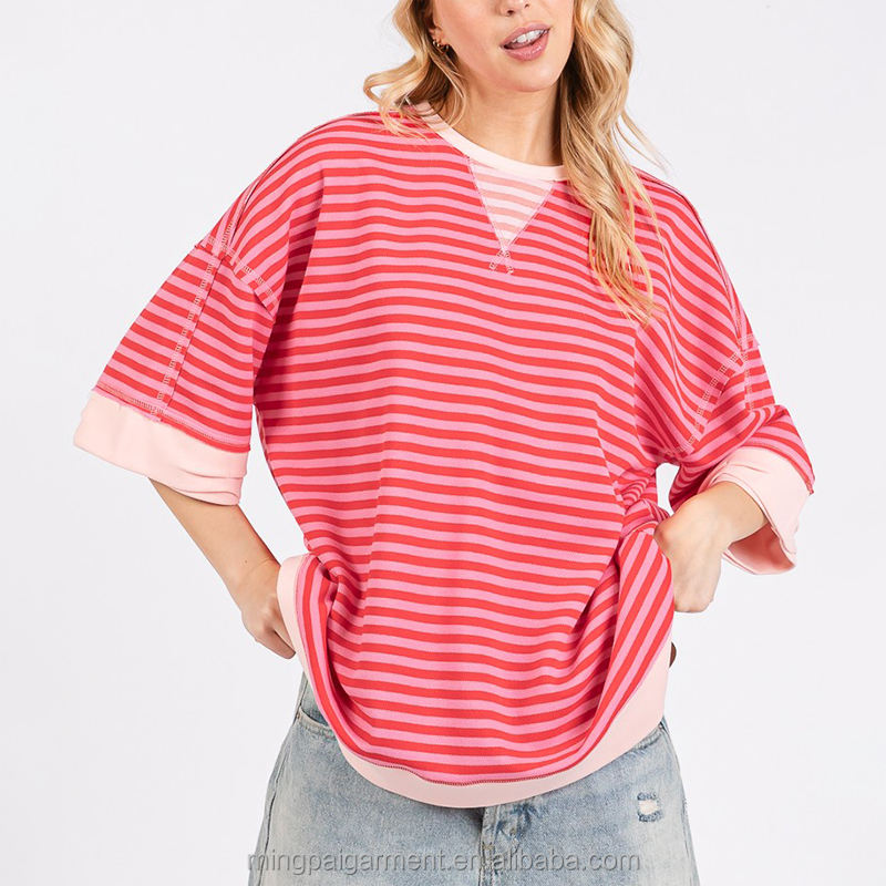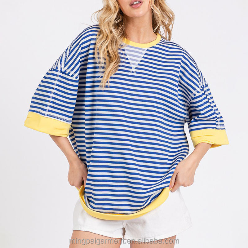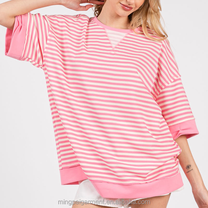T-shirt da donna a maniche corte a righe oversize in cotone di alta qualità, stile casual, collezione Primavera 2026