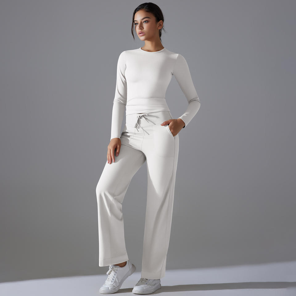 Custom High Quality Elegant Soft Casual Sportswear Women's Long-Sleeve T-Shirt and Wide Leg Legging Set