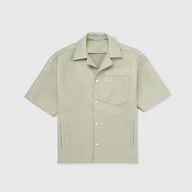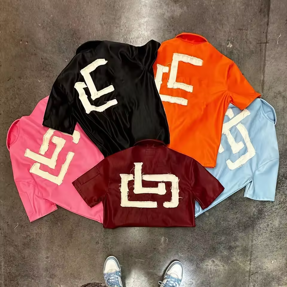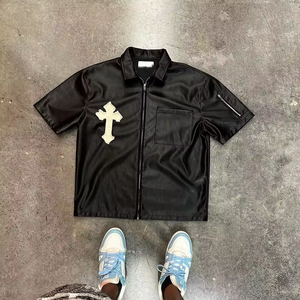 Camicia in finta pelle da uomo personalizzata di alta qualità giacca con Zip ricamata toppa manica corta con tasca sul petto