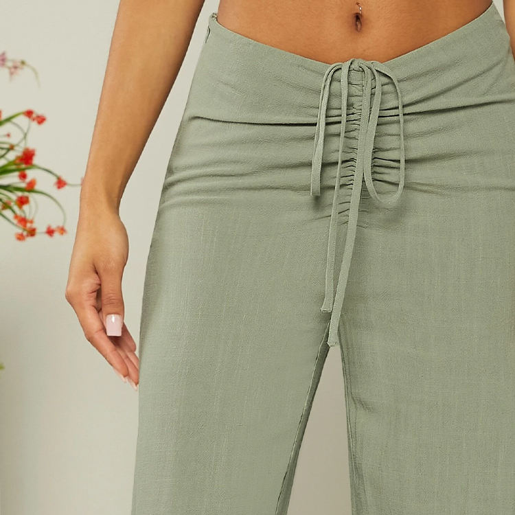 Custom High Quality Summer Green 100% Linen Trousers Loose Breathable Ladies Pure Linen Wide Leg Pants for Women