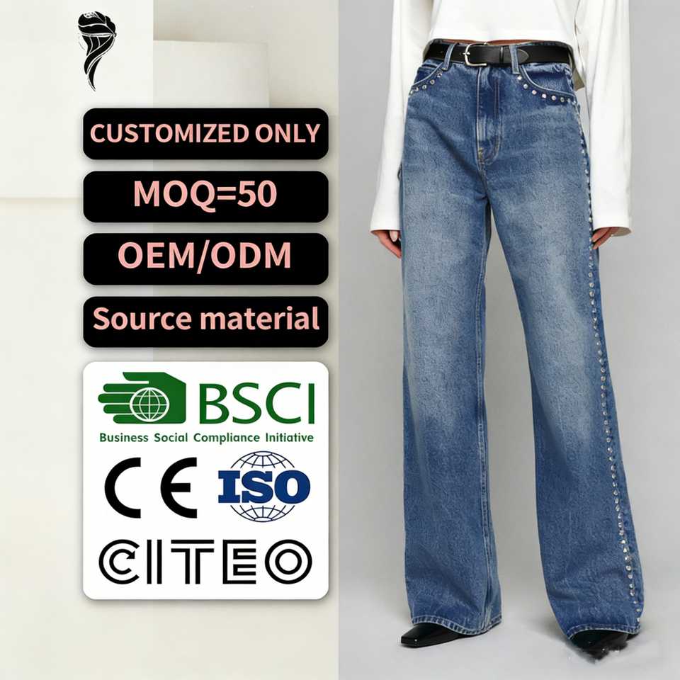 Jeans a Vita Alta Personalizzati con Borchie Argentate, Denim Blu Lavato, Jeans a Gamba Larga per Donna