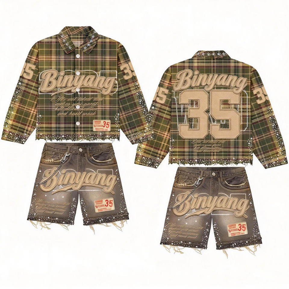 Completo da Uomo Personalizzato di Alta Qualità: Camicia a Quadri con Logo, Pantaloncini in Jeans, Tuta Corta con Bottoni Decorati in Strass