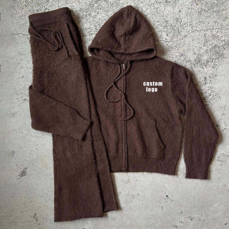 LOGO personalizzato con ricamo Jacquard Logo da uomo con cerniera spazzolata con cappuccio maglione e pantaloni in Mohair lavorato a Mohair completo completo