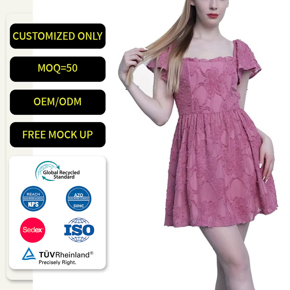 Custom Ladies Casual Empire Waist Modest Dress High Quality Floral Jacquard Pattern Embroidery Lace Burgundy Dress Short